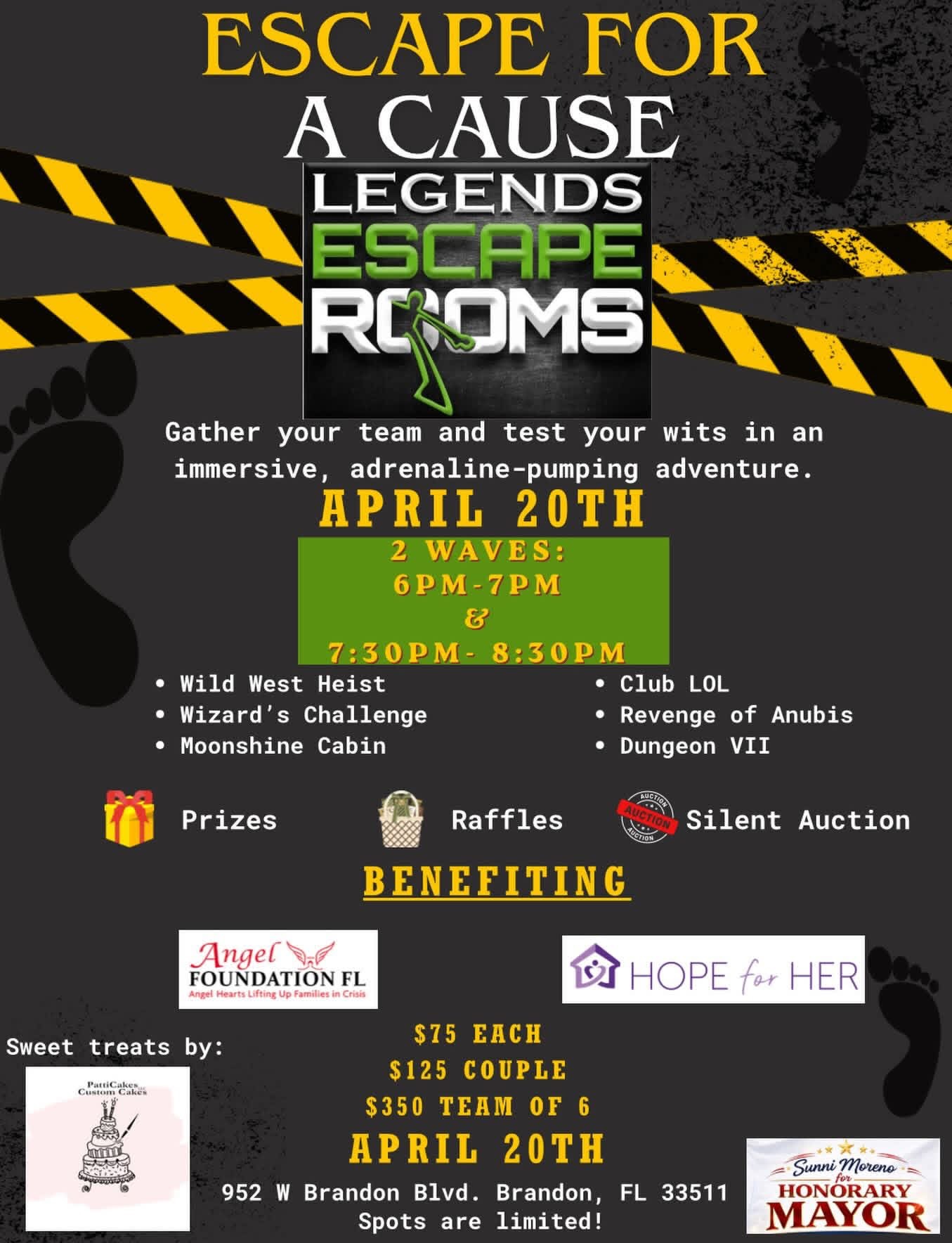 Sunni for Honorary Mayor Gather your team and testy your wits in an immersive, adrenaline-pumping adventure. 2 Sessions: 6-7 pm 7:30 pm -@8:30 pm $75/pp or $125/couple $350 Team of […]